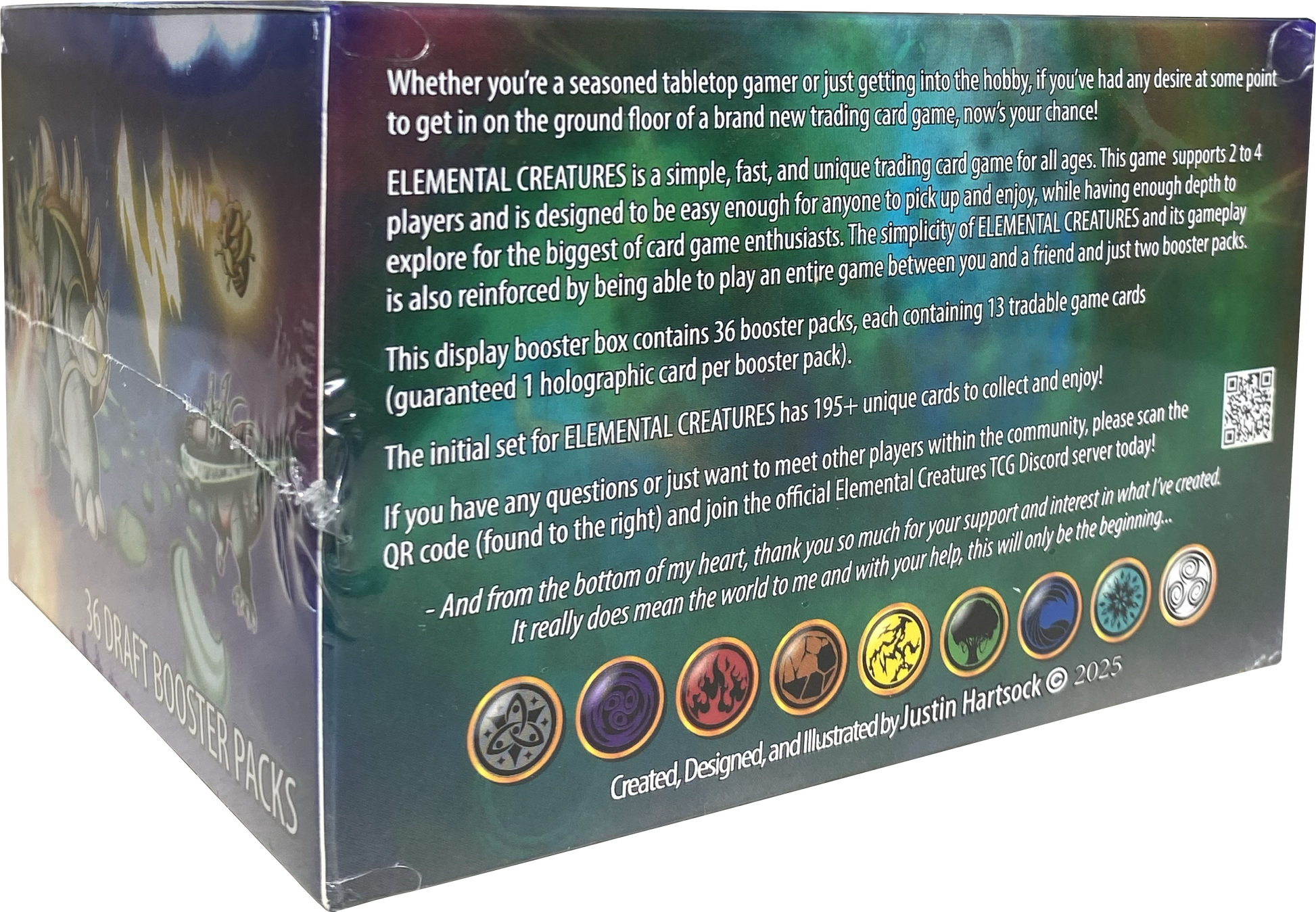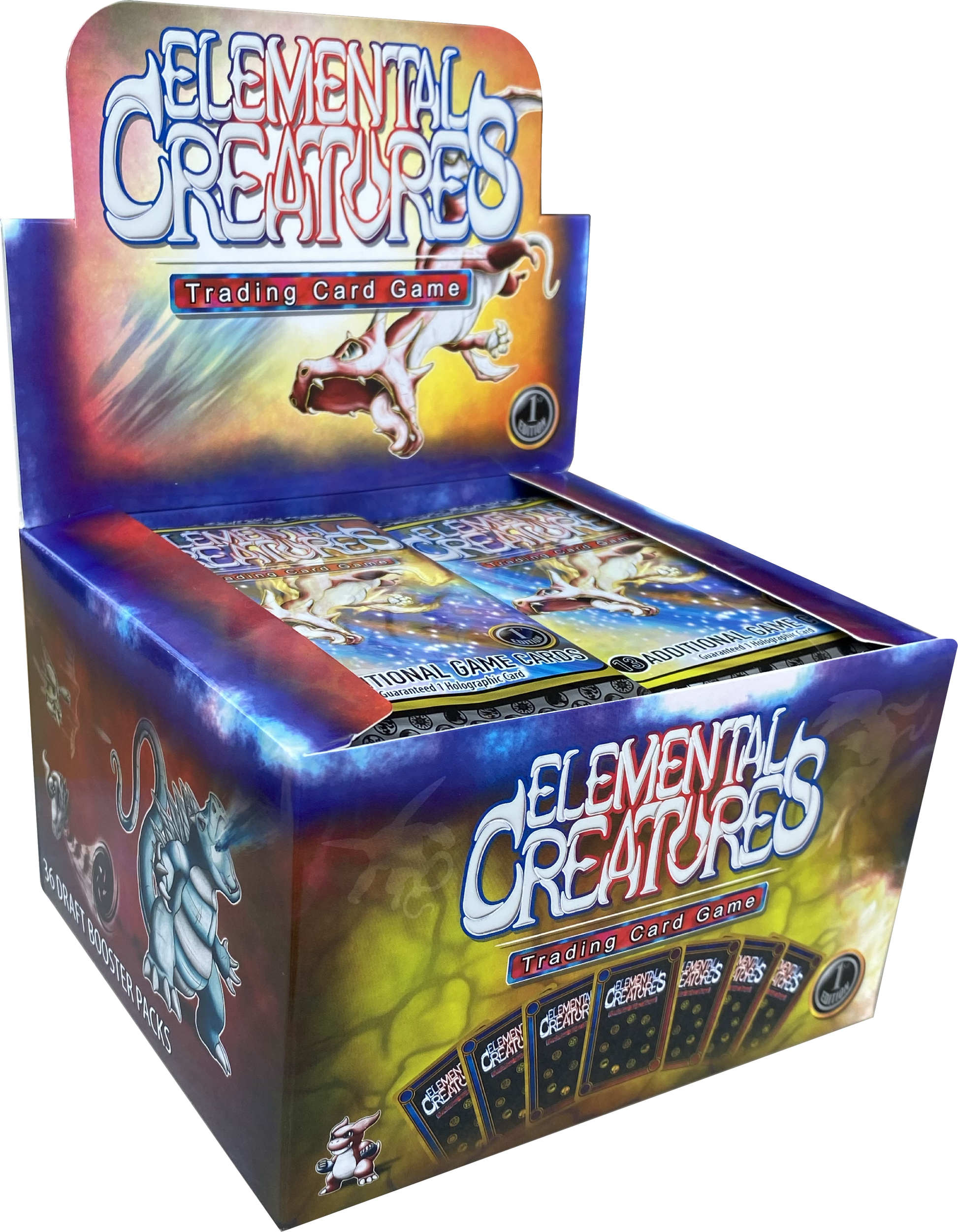 Elemental Creatures is an exciting new TCG made and designed right here in Augusta Georgia. Crack two packs for a quick and simple one on one game or bring your best constructed deck and see if you come out on top. Each booster box consists of 36 booster packs and each booster pack has 13 cards with one guaranteed holographic card.